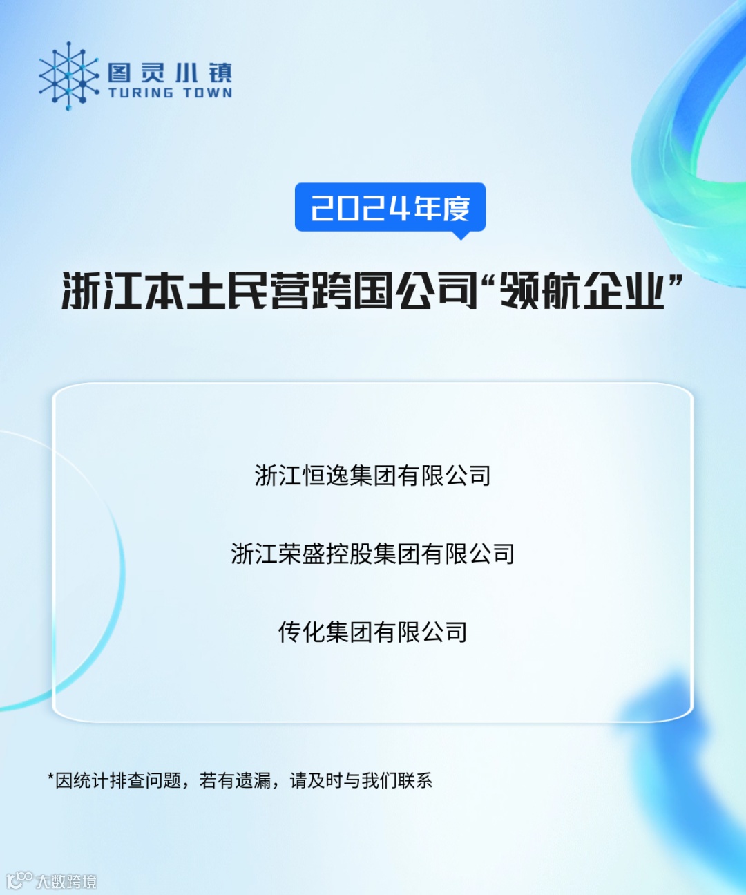 近日,省商务厅发布2024年度浙江本土民营跨国公司"领航企业"名单,萧山区共有7家企业成功入选,上榜数量位居全省首位。其中3家企业来自图灵小镇,分别是浙江恒逸集团有限公司、浙江荣盛控股集团有限公司、传化集团有限公司。
