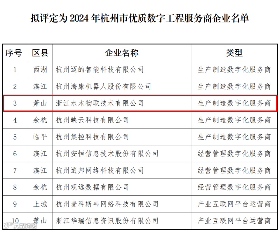 杭州市经济和信息化局公示了“拟评定为2024年杭州市优质数字工程服务商企业”的名单,小镇企业浙江水木物联技术有限公司成功入选。