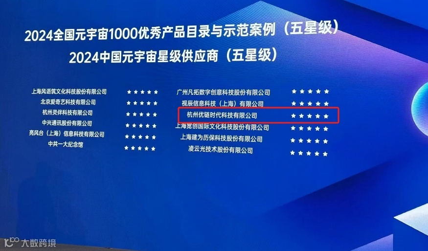 近日,2024全国元宇宙1000优秀产品示范案例与星级供应商榜单暨征集成果汇编在全国元宇宙供需对接大会正式发布。优链时代的“优链3D云阵相机”脱颖而出,成功入选《2024全国元宇宙1000优秀产品目录与示范案例》(五星级),同时荣获“2024中国元宇宙星级供应商”(五星级)。