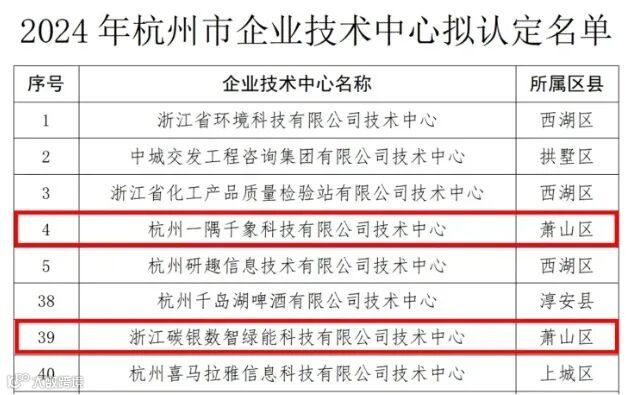 杭州市经济和信息化局公示2024年杭州市企业技术中心拟认定名单。其中,小镇企业杭州一隅千象科技有限公司、浙江碳银数智绿能科技有限公司2家企业入选市企业技术中心。