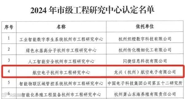 杭州市发改委发布2024年市级工程研究中心认定名单。由小镇企业龙兴航电承建的“航空电子杭州市工程研究中心”成功入选,获评市级工程研究中心。