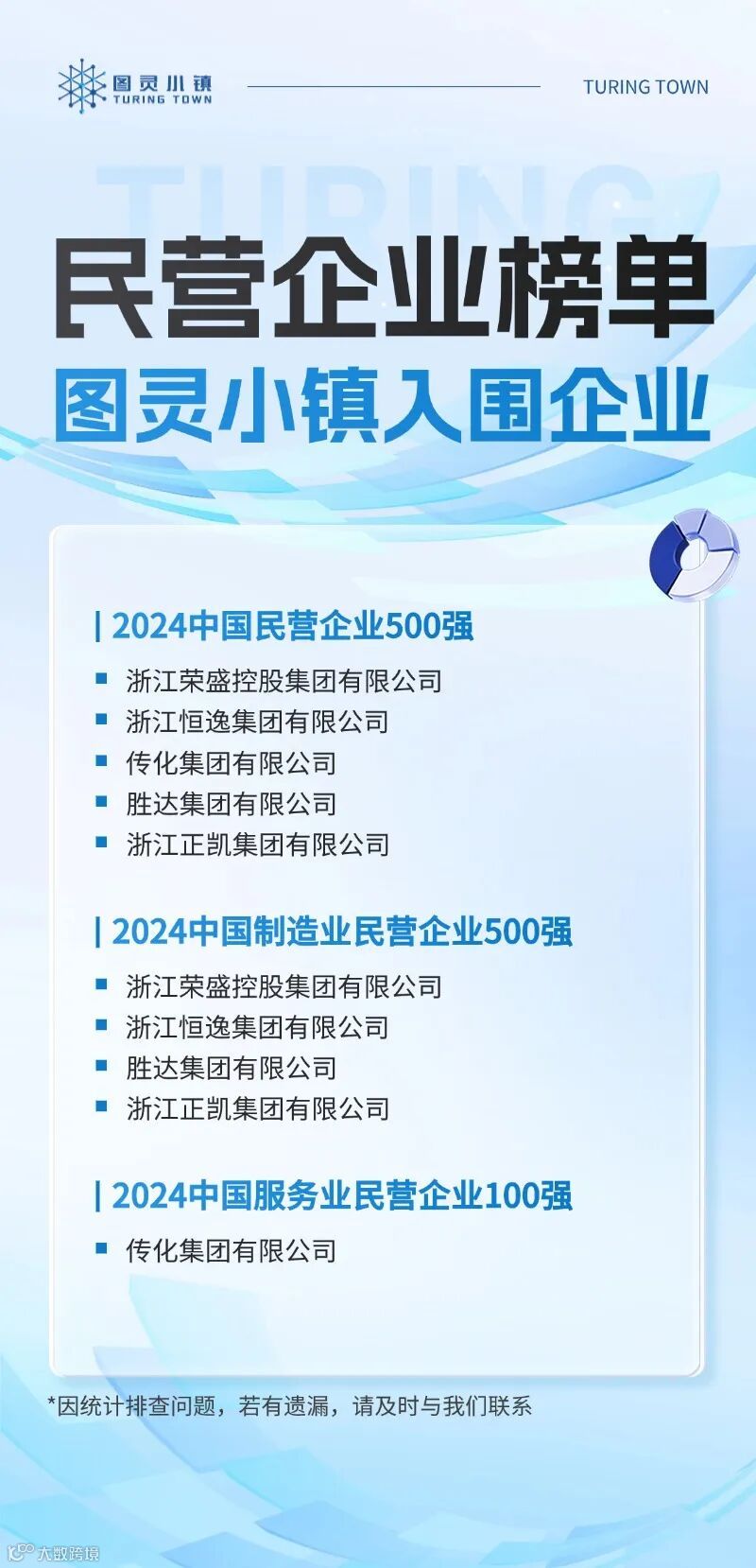 近日,2024中国民营企业500强、2024中国制造业民营企业500强、2024中国服务业民营企业100强等榜单相继发布。其中,荣盛控股集团、恒逸集团、传化集团、胜达集团、正凯集团等图灵小镇多家企业实力入围,民营企业发展态势稳中向好。