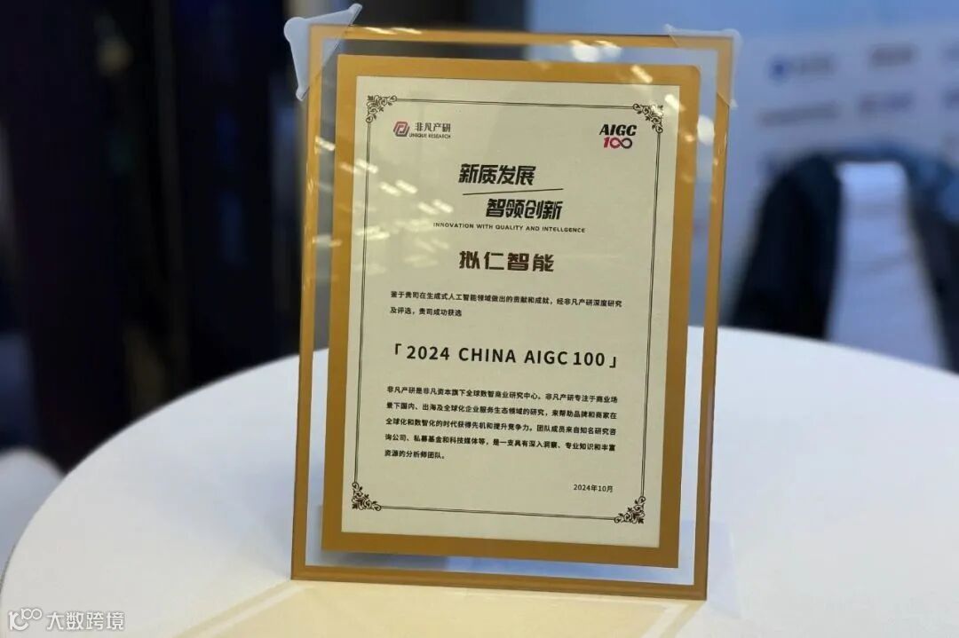 在AIGC应用发展高峰论坛上,“2024 CHINA AIGC 100”榜单隆重发布。经过严格的筛选与全面深入的评估,拟仁智能、整数智能凭借其卓越表现,在众多参选企业中脱颖而出,成功入选“2024 CHINA AIGC 100”榜单。