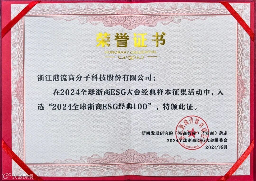 日前,在《浙商》杂志、银柿财经、世界浙商网、《浙商》全国理事会主办的2024全球浙商ESG大会上,“2024全球浙商ESG经典100”隆重发布,浙江港流高分子科技股份有限公司成功入选。此次入选体现了港流科技在企业发展过程中的环境价值、社会价值、经济价值,是对港流科技的可持续发展路径的认可与鼓励。