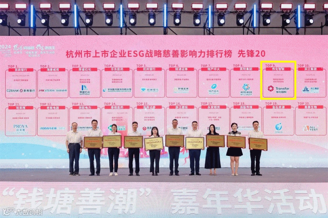 9月5日,2024杭州市“钱塘善潮”嘉年华活动正式启动,并现场发布《2024杭州市上市公司ESG战略慈善影响力排行榜》。其中,传化智联(002010.SZ)荣登“先锋20”榜单。