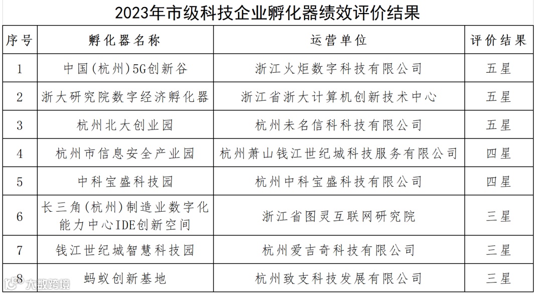 杭州市科学技术局发布2023年市级科技企业孵化器绩效评价工作结果,图灵小镇共有8家孵化器榜上有名。其中,中国(杭州)5G创新谷、浙大研究院数字经济孵化器、杭州北大创业园荣获“五星”优秀评价。