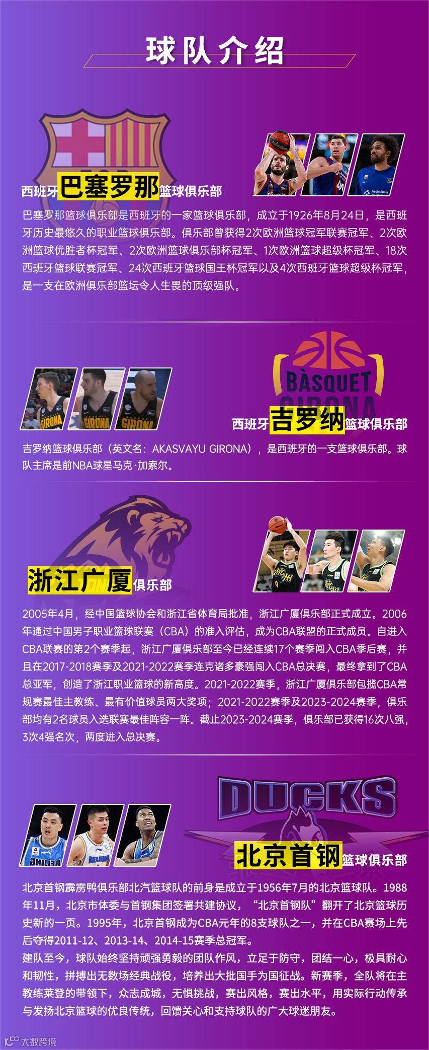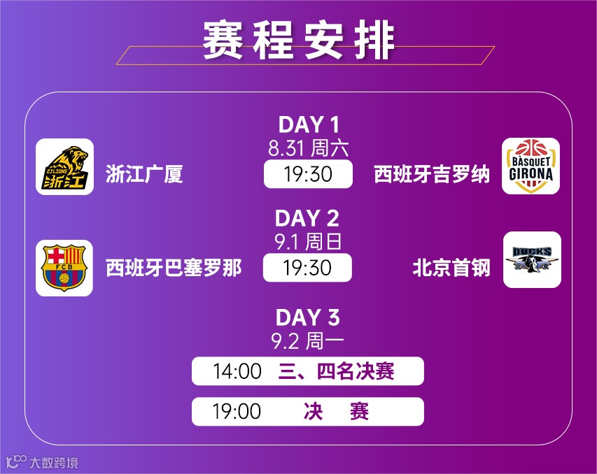 本次赛事将汇聚两支国际球队——西班牙巴塞罗那篮球俱乐部和西班牙吉罗纳篮球俱乐部,以及两支国内CBA球队——北京首钢篮球俱乐部和浙江广厦篮球俱乐部,在三天内进行四场精彩对决。