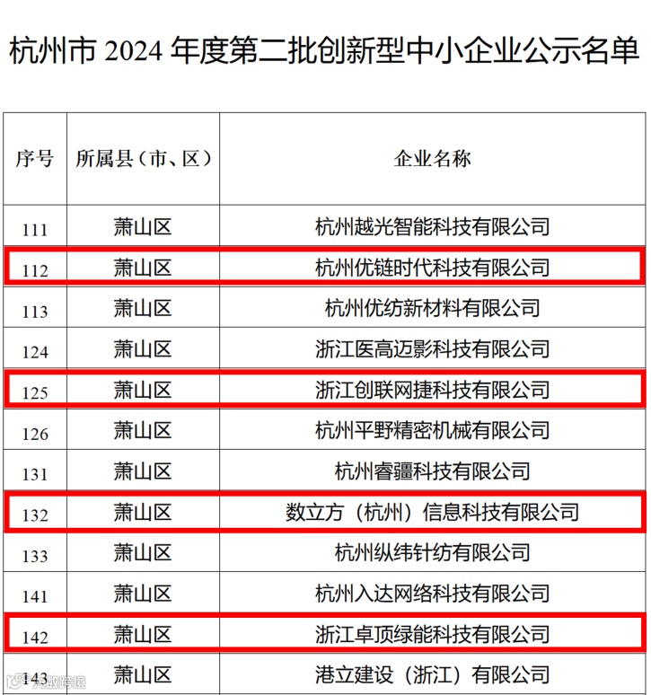 杭州市经济和信息化局发布杭州市2024年度第二批创新型中小企业的公示名单,优链时代、创联网捷、数立方、卓顶绿能4家小镇企业顺利入选。