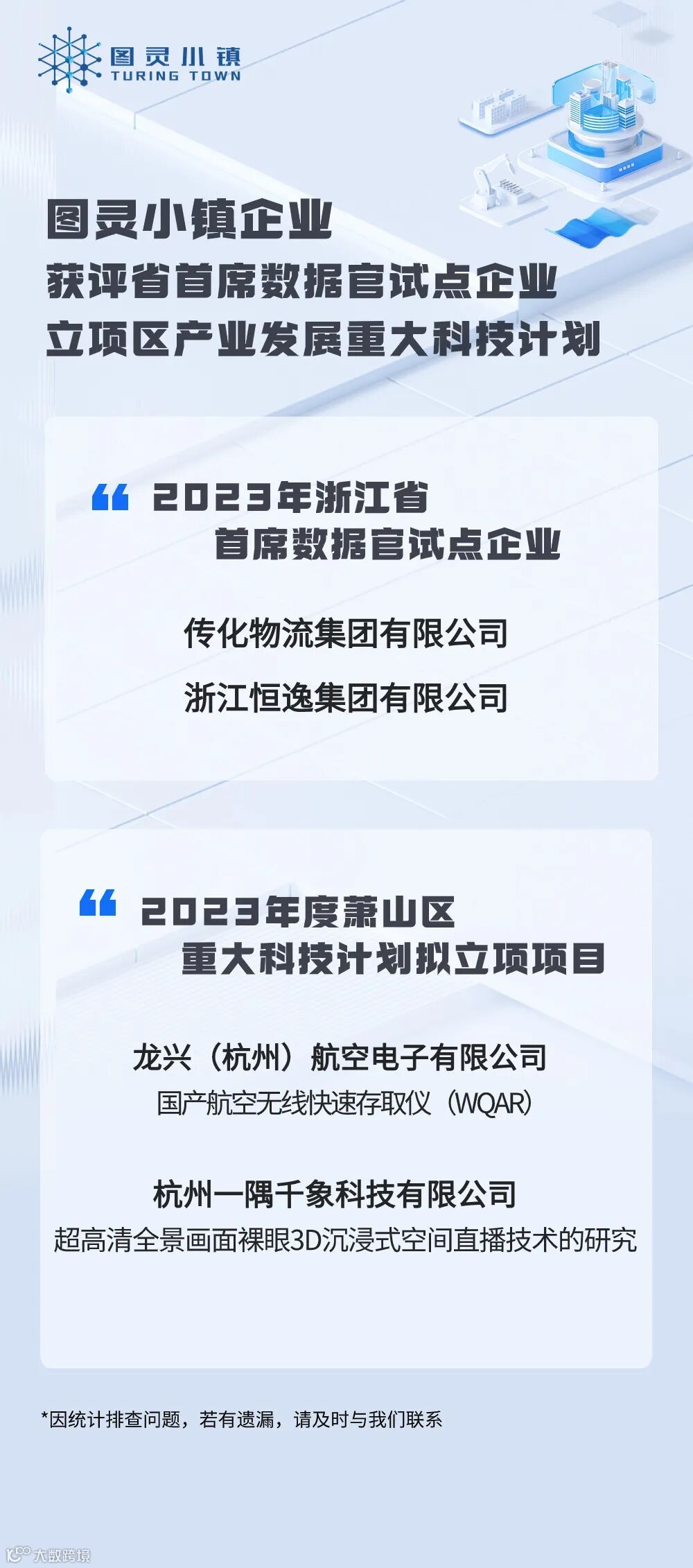 近日,浙江省经济和信息化厅、萧山区科学技术局公布2023年浙江省首席数据官试点企业、2023年度萧山区重大科技计划项目名单。其中,图灵小镇有2家企业获评省首席数据官试点企业、2家企业的研发项目列入区重大科技计划。