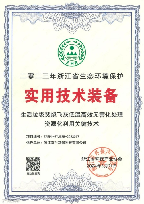 浙江京兰环保的“生活垃圾焚烧飞灰低温高效无害化处理资源化利用关键技术”成功入选2023年度浙江省重点生态环境保护实用技术装备名录,并收录于由浙江省生态环境厅指导、浙江省环保公共科技创新服务平台编著的《生态环境科技帮扶浙江实践探索》一书中。