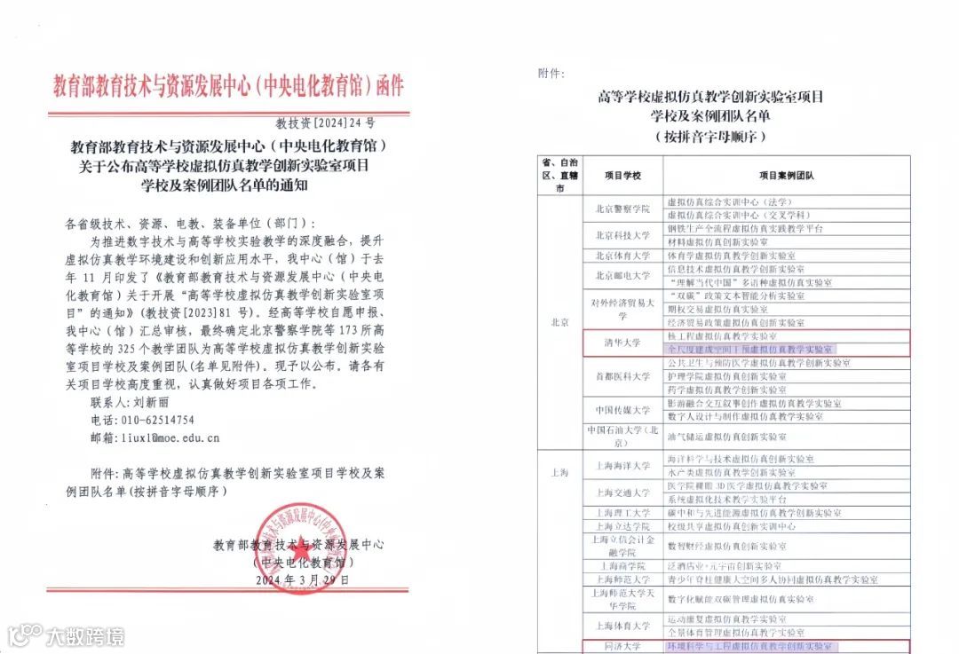 近日,教育部教育技术与资源发展中心(中央电化教育馆)发布了《关于公布高等学校虚拟仿真教学创新实验室项目学校及案例团队名单的通知》(教技资[2024]24号)。其中,图灵小镇科创企业一隅千象助力清华大学“全尺度建成空间干预虚拟仿真教学实验室”,同济大学“环境科学与工程虚拟仿真教学创新实验室”成功入选高等学校虚拟仿真教学创新实验室项目。