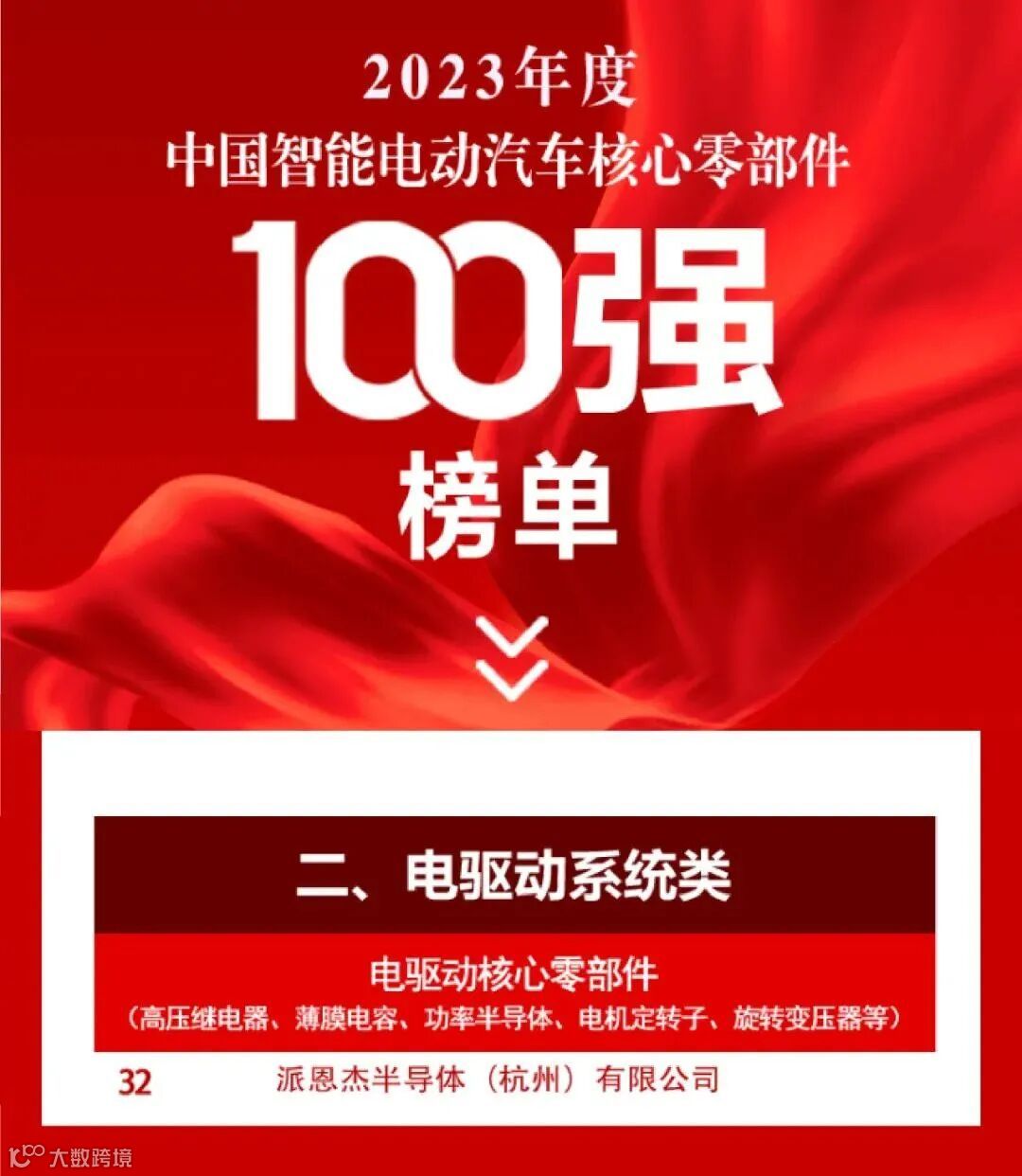 12月8日,第十届电车人大会暨2023年度中国智能电动汽车核心零部件100强颁奖盛典举行,会上发布了2023年度“核心零部件100强”榜单。作为国内领先的第三代半导体功率器件供应商,小镇企业派恩杰半导体凭借优质客户覆盖、领先器件性能等优势,在500余家全国参评同行中脱颖而出,成功上榜。