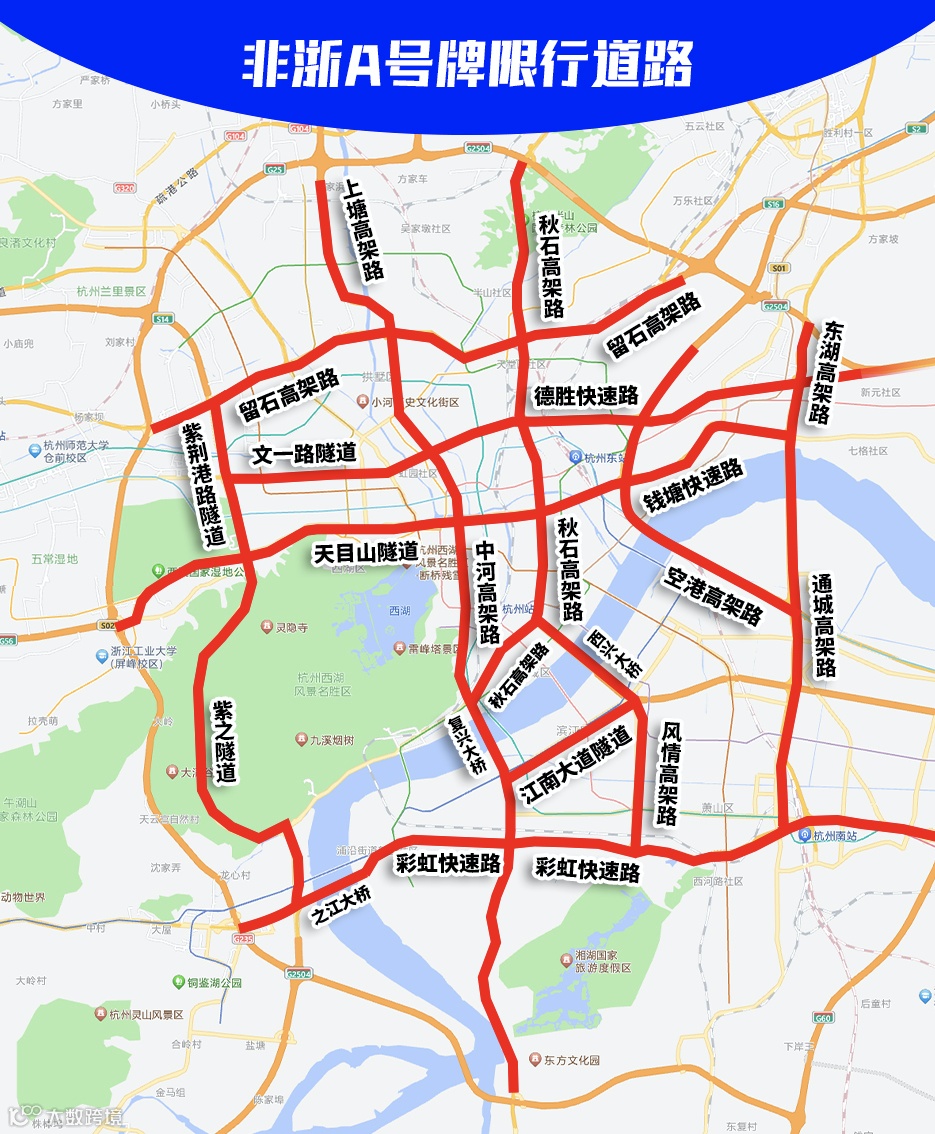 限行规则:含非浙A蓝牌、新能源小客车,全号段禁止通行。