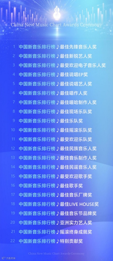 中国新⾳乐排⾏榜颁奖盛典将在12⽉15⽇晚开始,现场将揭晓包括中国新⾳乐排⾏榜亚洲实⼒艺⼈奖、中国新⾳乐排⾏榜摇滚成就奖、中国新⾳乐排⾏榜特别贡献奖等在内的共计22项奖项。演出开场邀请国内DJ及⼥团,同时还有多轮⼤编制乐队现场演出,这不只是⼀场颁奖盛典,也是⼀场精彩绝伦的⼤型演出。