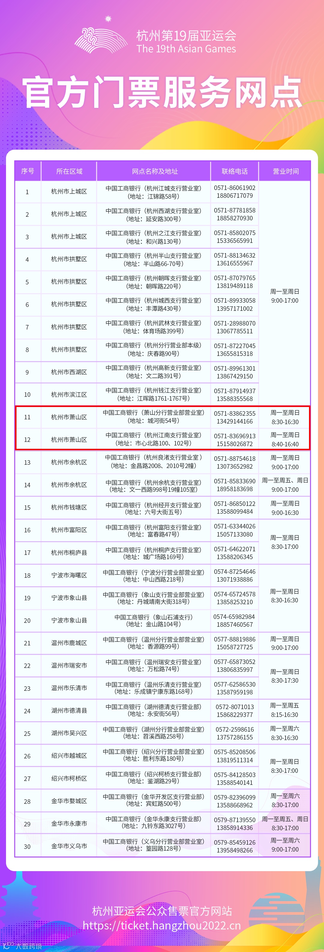 杭州第19届亚运会官方线下购票渠道于8月23日起陆续对社会开放,为公众提供体育比赛项目线下购票及电子票兑换纸质票服务。官方线下购票渠道包括竞赛场馆售票亭和官方门票服务网点(工商银行网点),涵盖杭州及宁波、温州、湖州、绍兴、金华5个协办城市。
