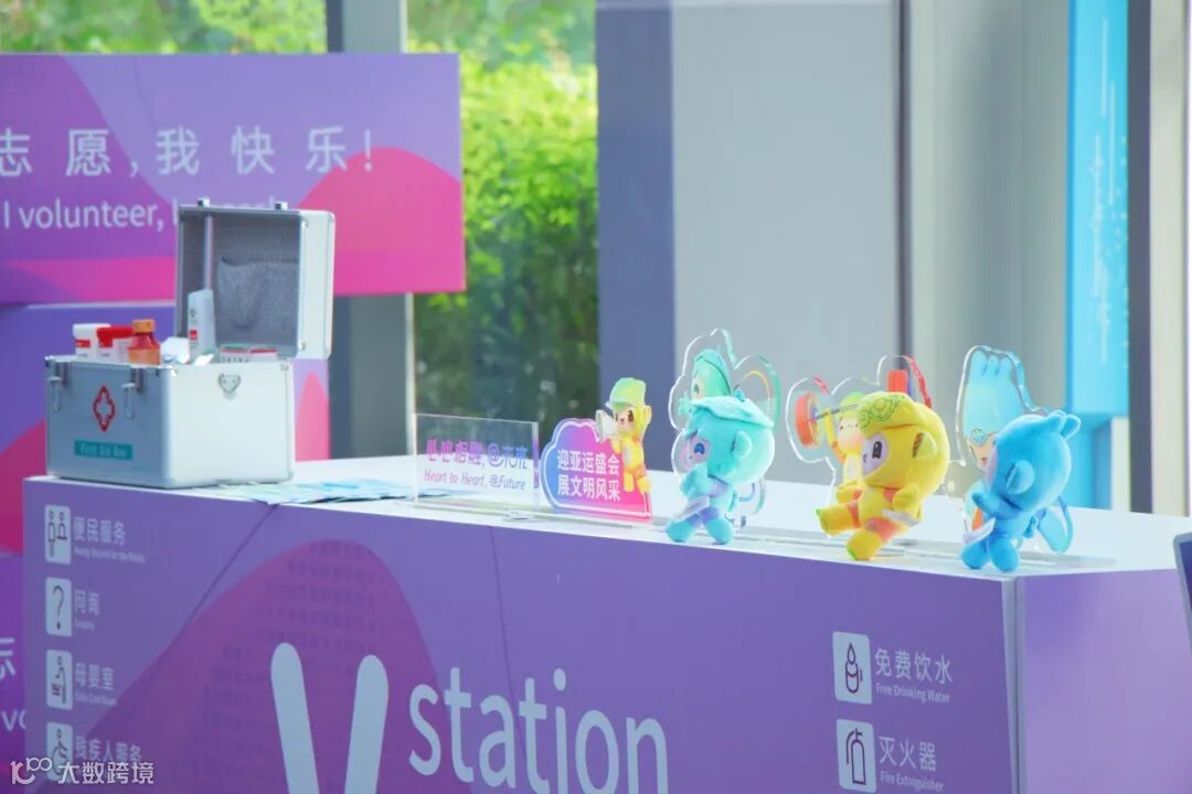 站点的主体部分是带有“亚运青年V站”LOGO的咨询服务台,可为市民游客提供问询、母婴室、应急救助、免费饮水、手机充电、共享轮椅等便民服务。