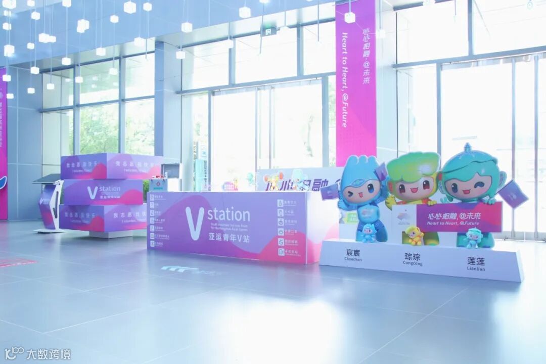 图灵小镇亚运青年V站位于图灵小镇会客厅内,以“虹韵紫”为主色调,精美的设计、可爱的吉祥物和各色亚运主题口号等让人眼前一亮,置身其中,满满的亚运氛围扑面而来。