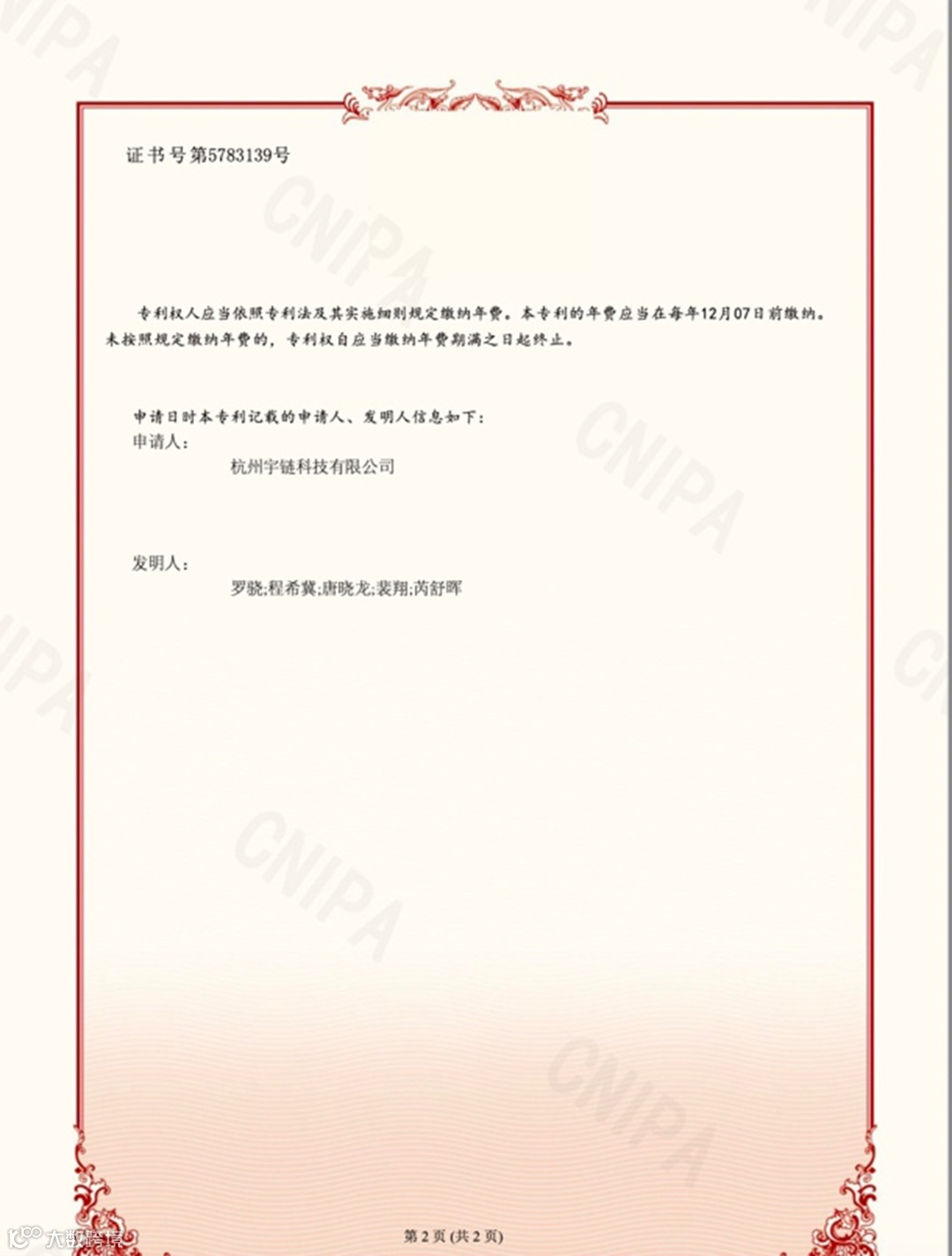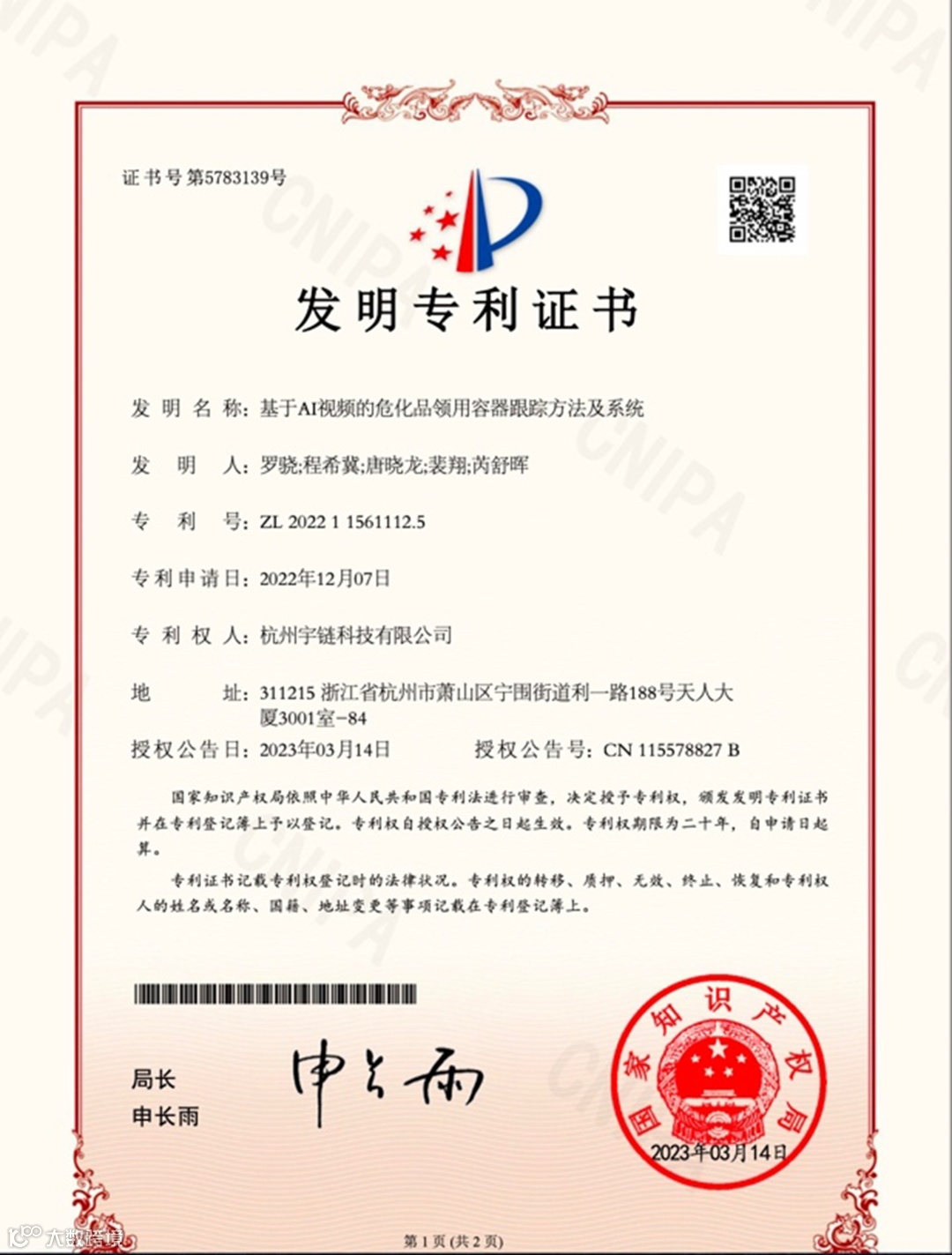 宇链科技“基于AI视频的危化品领用容器跟踪方法及系统”获得国家发明专利证书。
