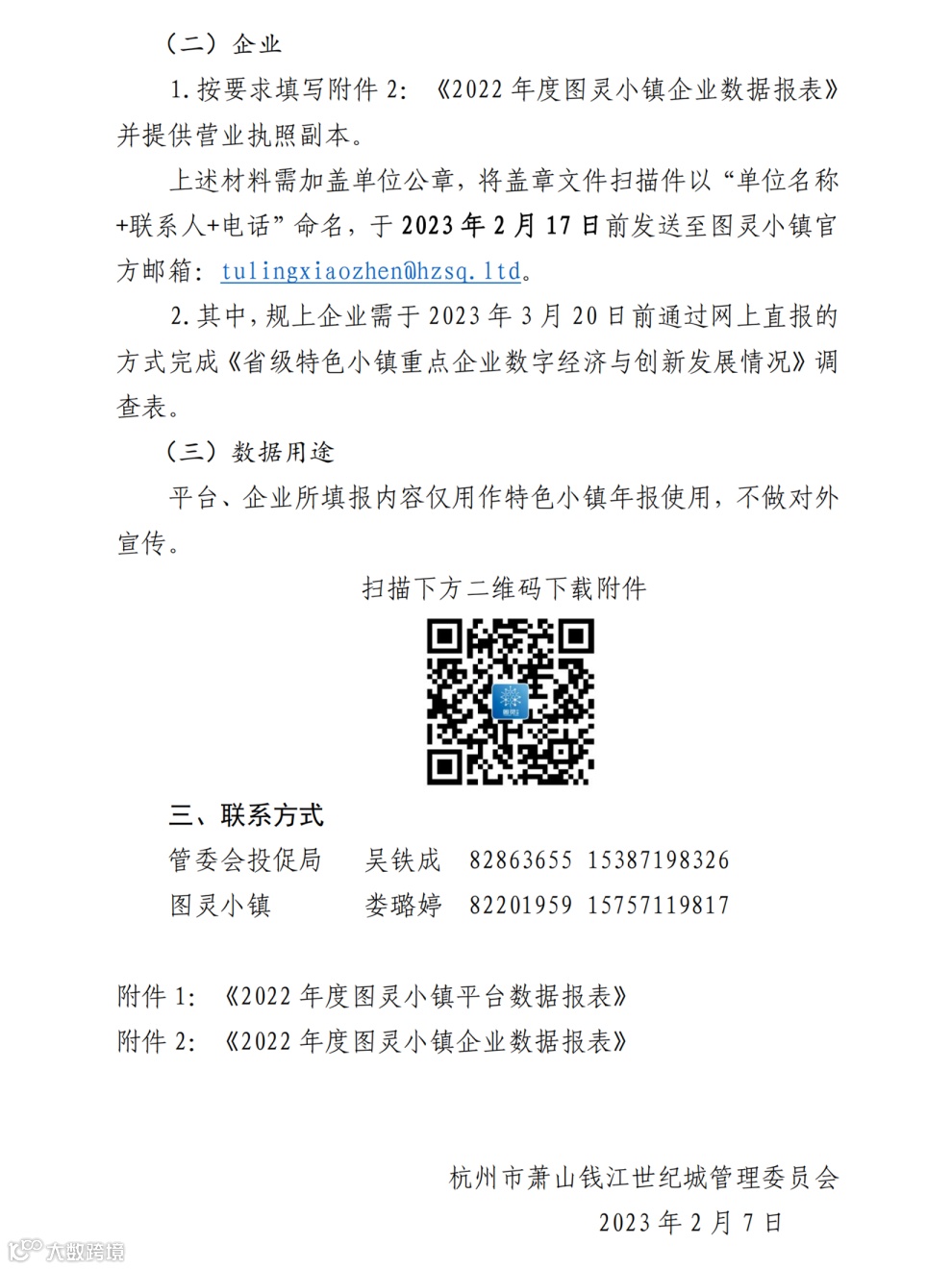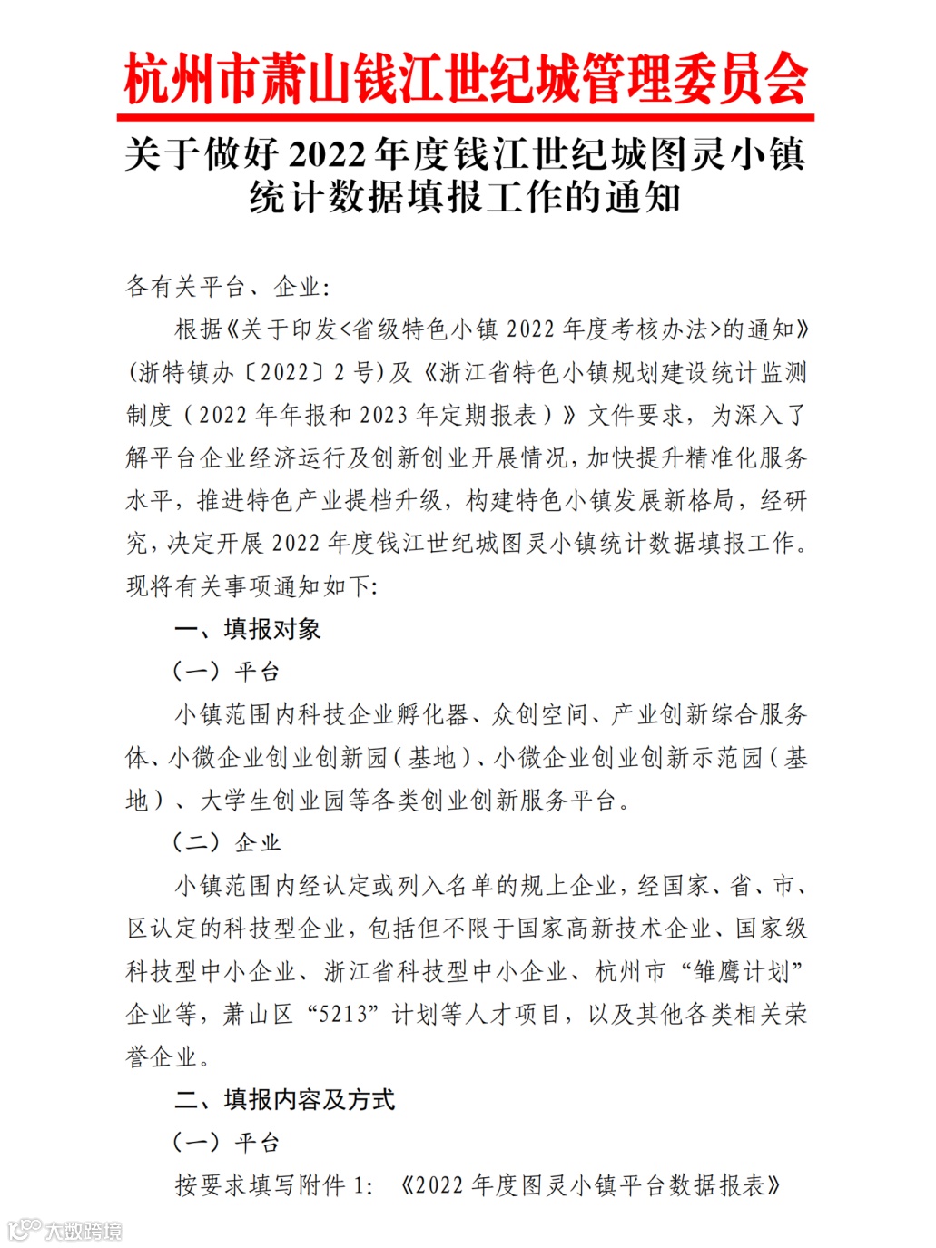 根据《关于印发<省级特色小镇2022年度考核办法>的通知》(浙特镇办〔2022〕2号)及《浙江省特色小镇规划建设统计监测制度(2022年年报和2023年定期报表)》文件要求,为深入了解平台企业经济运行及创新创业开展情况,加快提升精准化服务水平,推进特色产业提档升级,构建特色小镇发展新格局,经研究,决定开展2022年度钱江世纪城图灵小镇统计数据填报工作。现将有关事项通知如下: