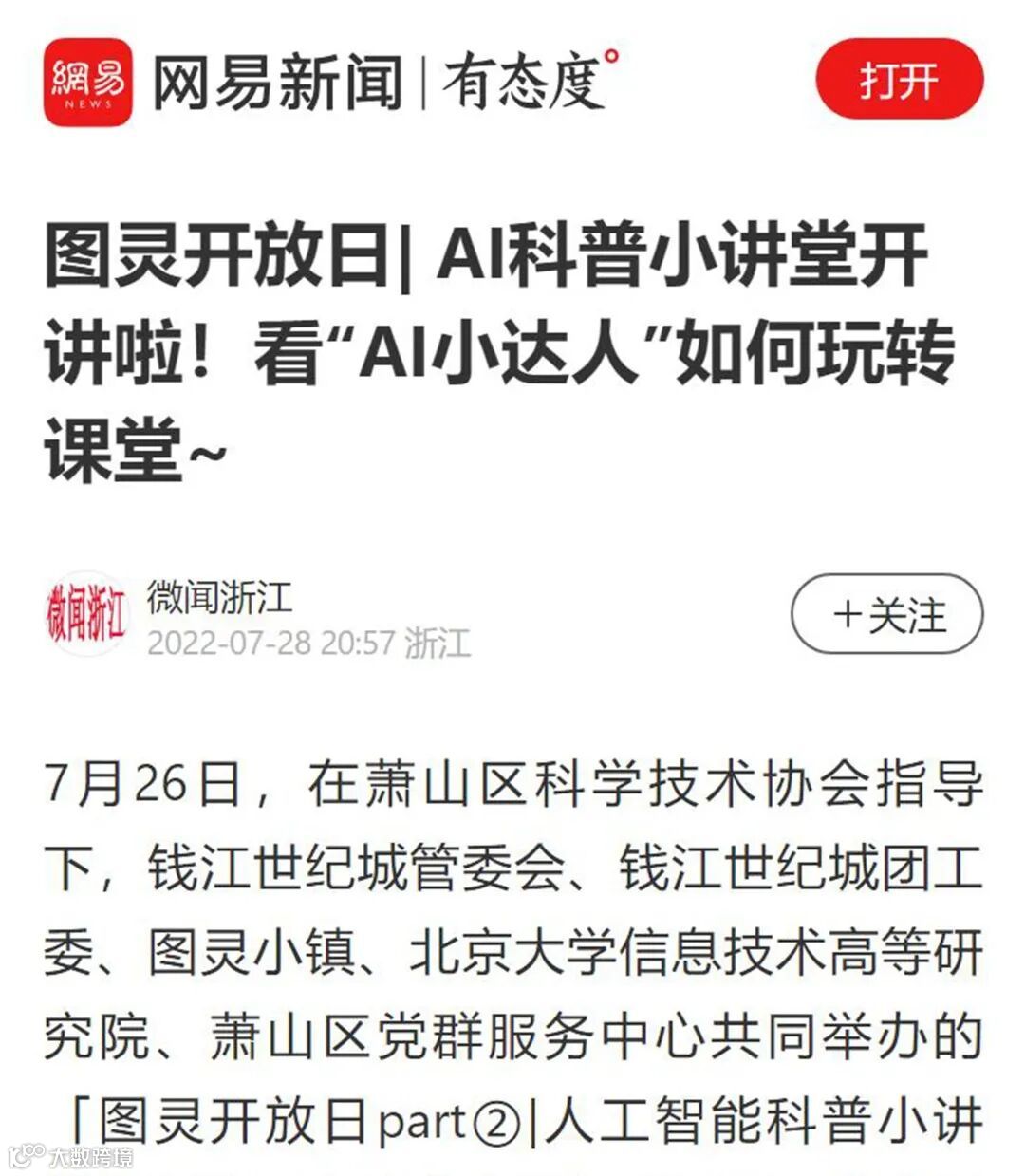 8月10日,学习强国杭州平台报道「图灵开放日|AI科普小讲堂」活动,彰显小镇数智文旅魅力。