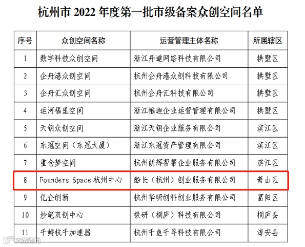 近日,杭州市科技局公布2022年度第一批市级备案众创空间名单,图灵小镇内的Founders Space杭州中心上榜。