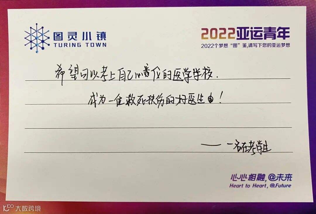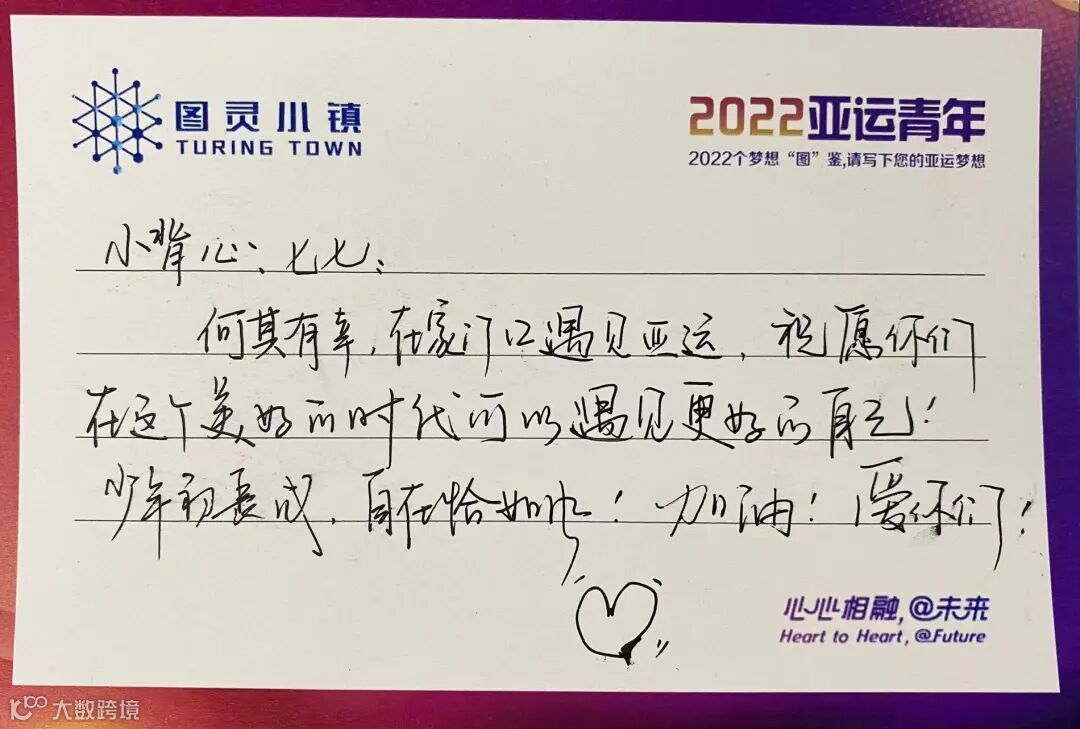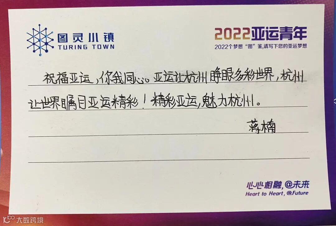 随着亚运会的脚步越来越近,社会各界关心亚运、支持亚运、参与亚运的氛围也日渐浓厚。在钱江世纪城管委会的指导下,图灵小镇特别策划了以“2022亚运青年,2022个梦想‘图’鉴”为主题的亚运梦想征集活动,以明信片的形式迎接杭州亚运会、祝福运动健儿,表达对杭州亚运会的祝福和期待,分享自己的亚运梦想和故事。