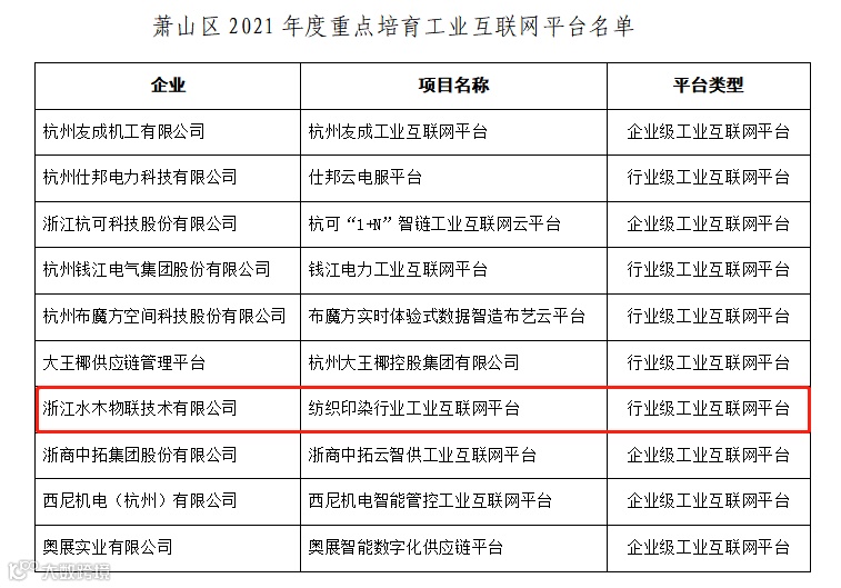 11月,小镇企业浙江水木物联技术有限公司项目——纺织印染行业工业互联网平台上榜萧山区2021年度重点培育工业互联平台。