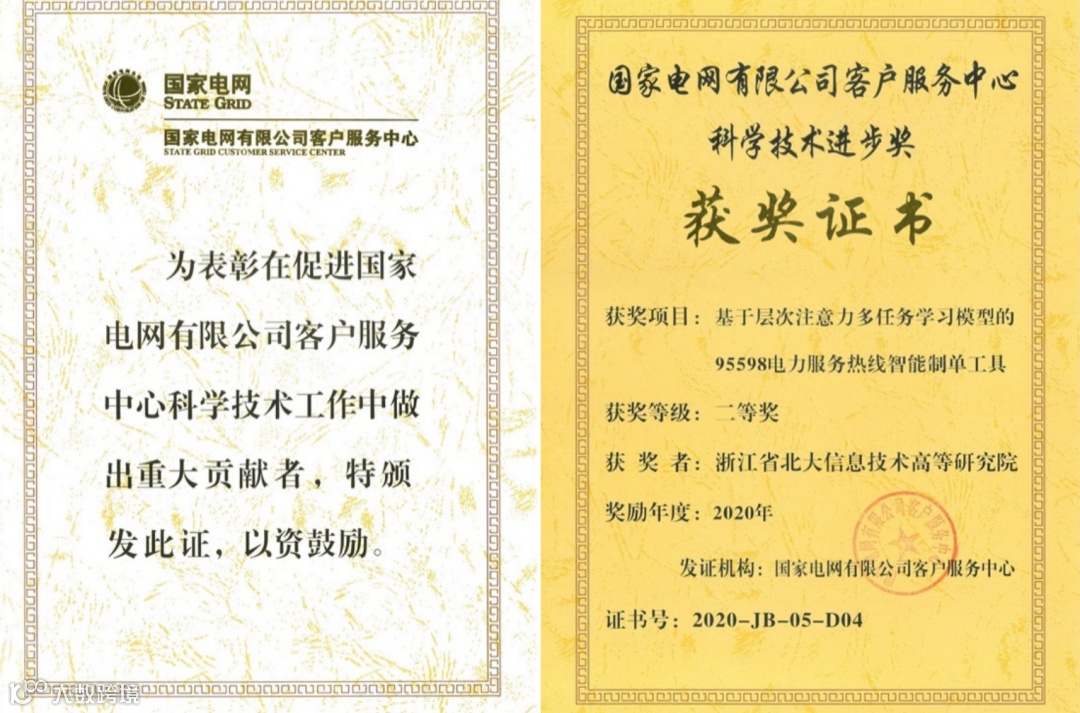 11月,北京大学信息技术高等研究院智能软件技术与应用研究中心为国家电网有限公司客户服务中心研发的“基于层次注意力多任务学习模型的95598电力服务热线智能制单工具”荣获“国家电网有限公司科学技术奖”二等奖。