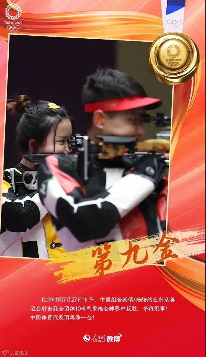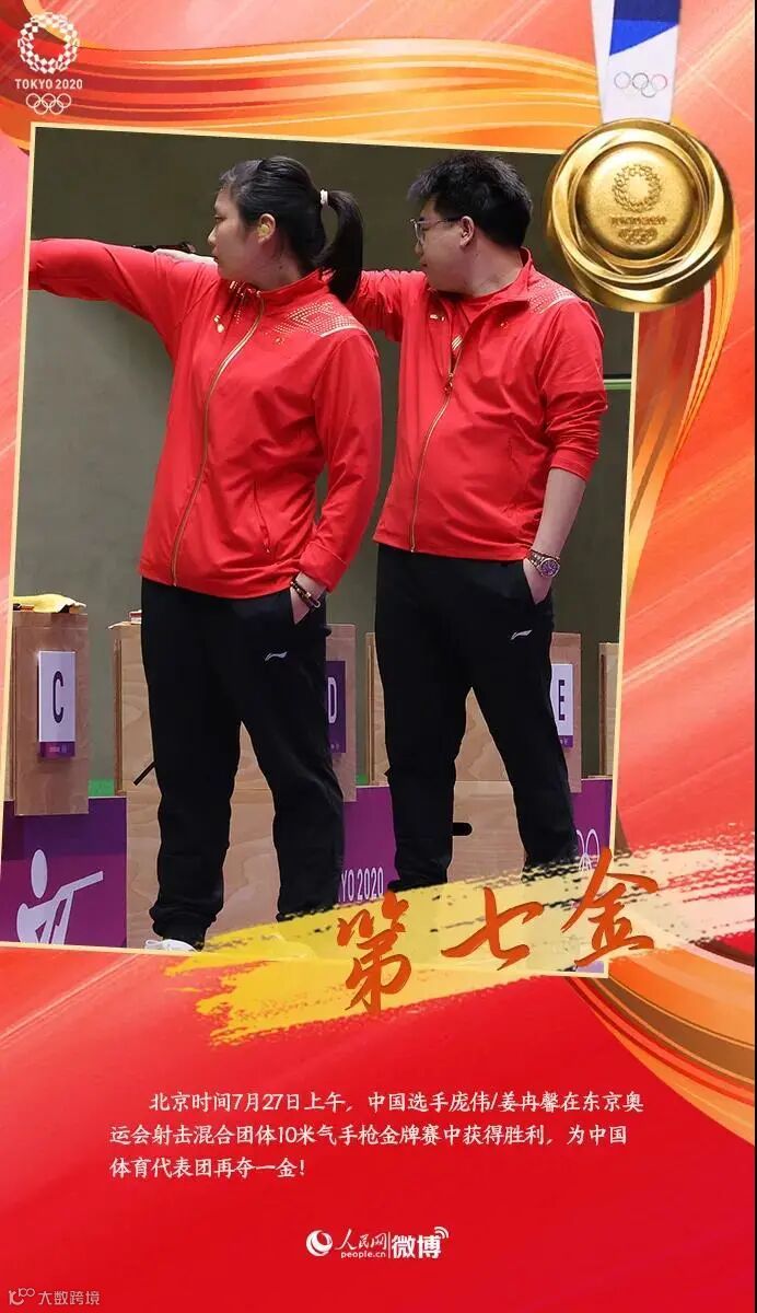 • 北京时间7月27日上午,中国选手庞伟/姜冉馨在东京奥运会射击混合团体10米气手枪金牌赛中获得胜利,为中国体育代表团再夺一金!