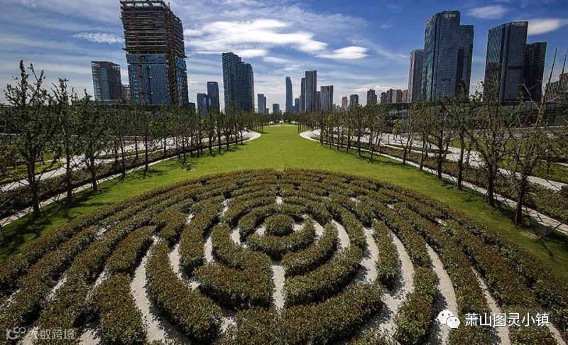 图灵小镇内包含一个综合体公园——钱江世纪公园,她作为G20峰会的配套项目落地,是集商业、旅游、休闲娱乐、文体活动为一体的综合景观公园。占地约60万平方米,建筑面积约16万平方米,地面建筑约8万平方米,绝大部分建筑不超过10米,错落在35万平方米的景观绿化中,建筑密度低,生态环境独一无二。公园整体呈T字型,东西向沿江而建,全长约4公里,南北向内陆纵深约1公里。