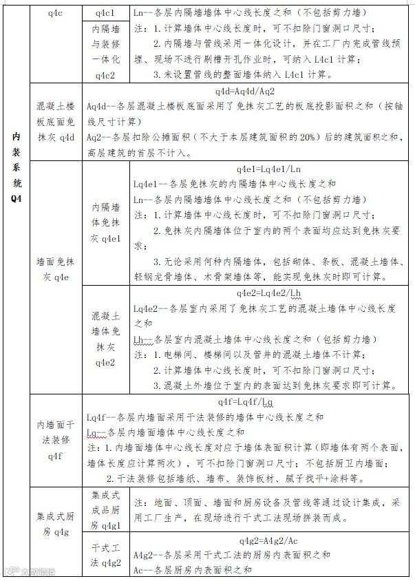 1.单体建筑装配率的计算范围为单体建筑室外地坪以上的部分。单体建筑若存在多个室外地坪,取标高较低的室外地坪以上(地下或半地下车库除外);平屋顶以上楼梯间、电梯机房、设备间部分可不列入计算范围。