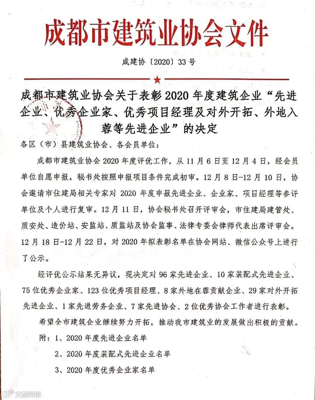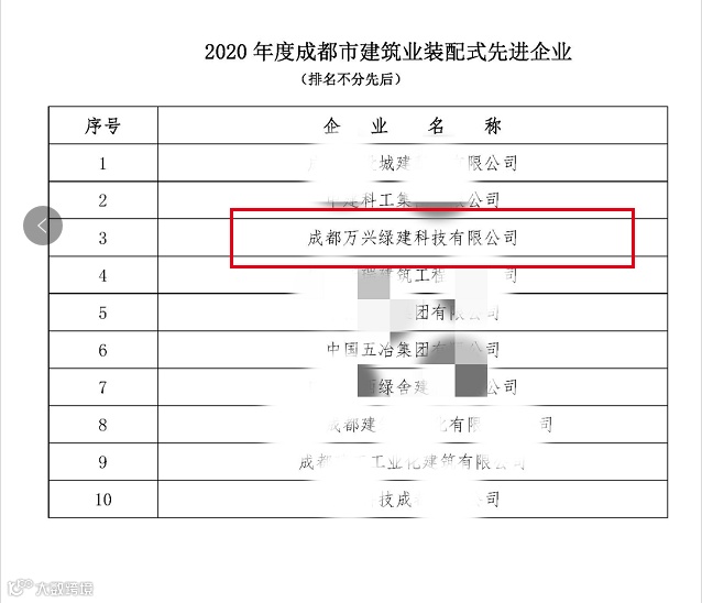 2020年12月,我司被成都市建筑业协会评为“2020年度装配式先进企业"。