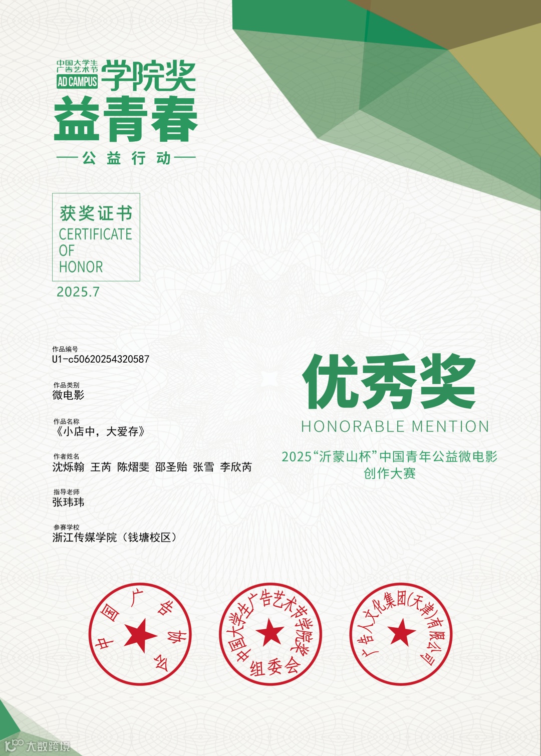 近日,2025 “沂蒙山杯” 中国青年公益微电影创作大赛结果公布,浙江传媒学院积极组织学子参与,共投递 12 组作品,最终 4 件作品成功入围,1 件作品斩获 “优秀作品” 荣誉。其中,由沈烁翰、王芮、陈熠斐、邵圣贻、张雪、李欣芮创作,张玮玮老师指导的《小店中,大爱存》凭借对基层公益实践的真实呈现,成为本次赛事中学校的代表性获奖作品。