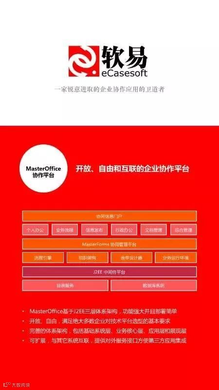 软易MasterOffice协同办公系列软件提供面向企业业务流程,跨应用系统服务,集团化私有云及社交化于一体的现代办公OA服务。
