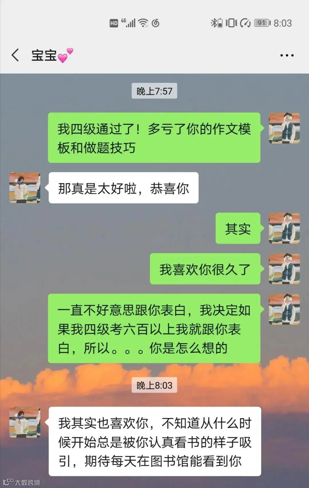 功夫不负有心人,610分!我迫不及待地跟她分享了这个消息,也终于鼓起勇气向她表白。