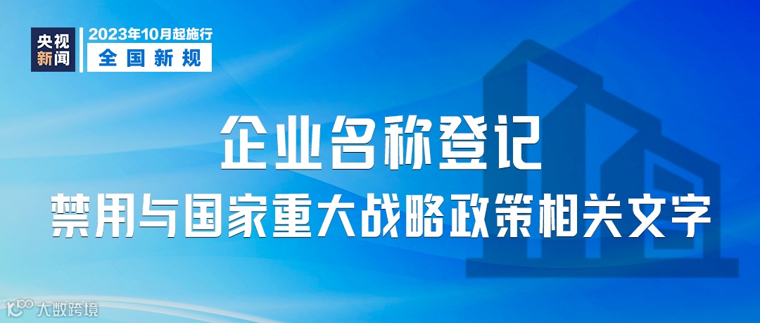 《企业名称登记管理规定实施办法》10月1日起施行。严厉禁止使用与国家重大战略政策相关的文字,使公众误认为与国家出资、政府信用等有关联关系。规定对企业名称冠以“中国”“中华”“中央”等字词的,按照法律法规规定从严审核。