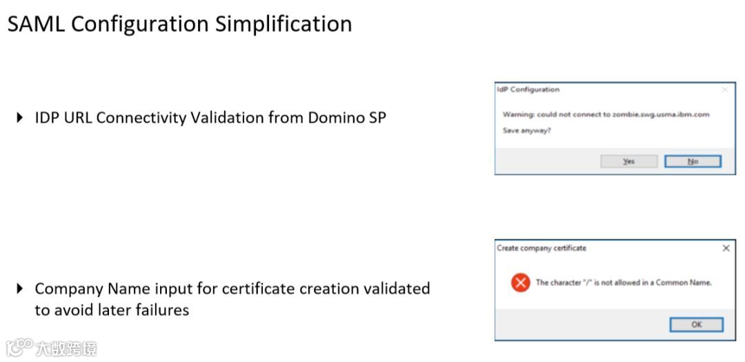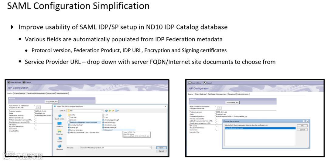 SAML配置更加简单,在Domino V10中,使用IDP Catalog数据库来配置SAML IDP/SP功能(如很多字段会自动通过身份验证提供者联邦的metadata数据进行填充)。