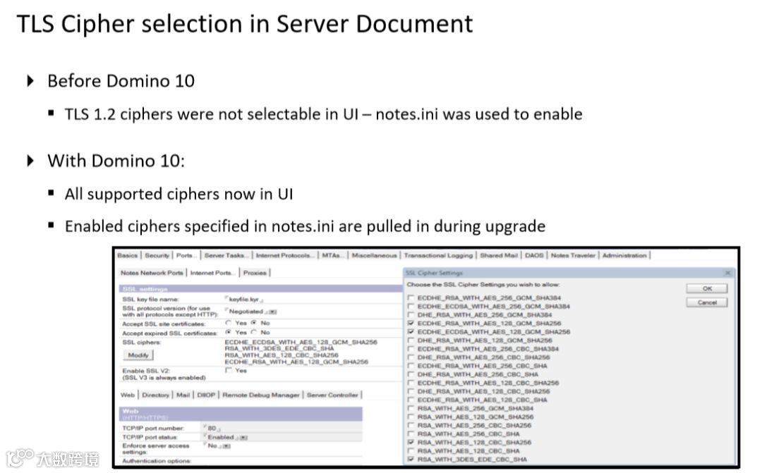 这只能算一个非常小的改动。在过去,Domino中的Internet任务(如HTTP)要使用TLS 1.2协议加密算法,必须通过设置notes.ini参数;在Domino 10中,现在可以直接通过服务器文档中的选项来进行设置。