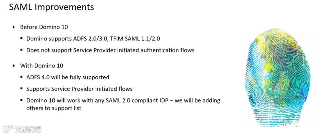 首先是SAML提升,支持联合登录服务ADFS 4.0、支持SP(服务提供者)发起的流程,Domino V10同样可以和支持SAML 2.0认证的IDP(身份验证提供者)协同工作。