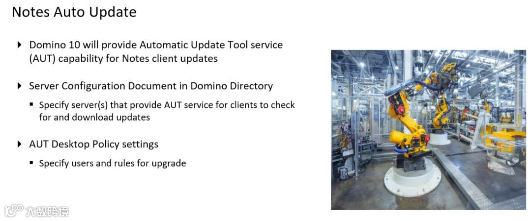 这是很多企业想要的功能,让Notes客户机和浏览器那样实时在线自动更新,虽然以前有Smart Upgrade功能,但用起来还是有些不就手。Domino V10中将会提供自动更新工具(AUT)来实现Notes客户机的更新和升级。AUT可通过服务器配置文档和桌面策略设置来实现。