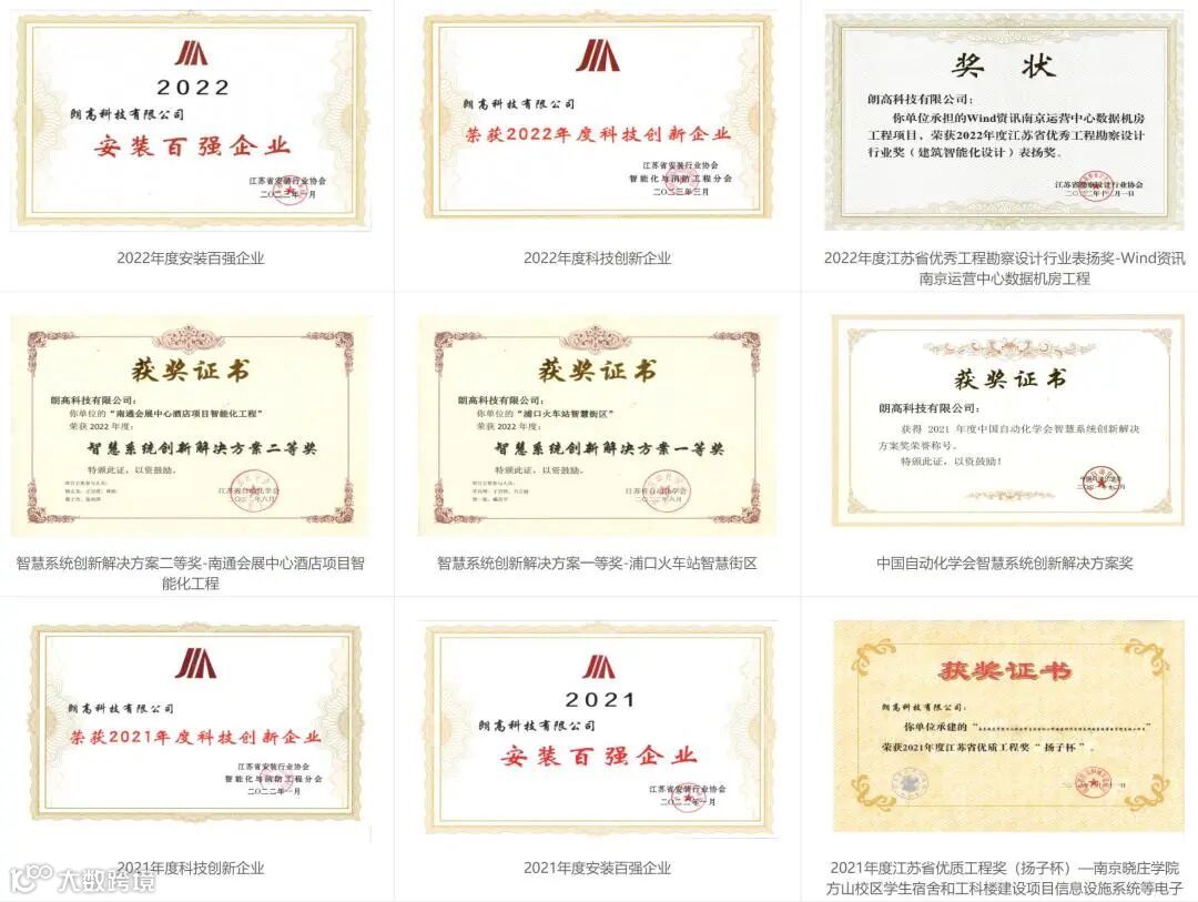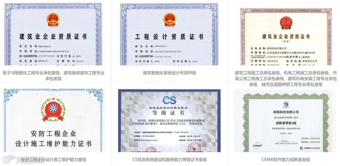 朗高科技拥有电子与智能化工程专业承包壹级资质、建筑智能化系统设计专项甲级资质;涉密信息系统集成资质、CS信息系统建设和服务能力;建筑工程、机电工程、市政公用工程施工总承包资质;机电设备安装工程、城市及道路照明工程、建筑装修装饰工程等多项专业承包资质,公司作为国家高新技术企业与江苏省“守合同重信用”企业,通过了质量、环境、职业健康安全管理体系、国家信息安全管理及信息技术服务管理等体系认证,软件能力成熟度模型认证体系。