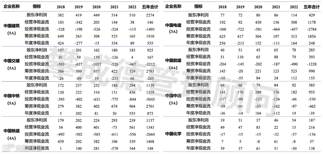 表2 八大建筑央企2018-2022年经营净现金流情况