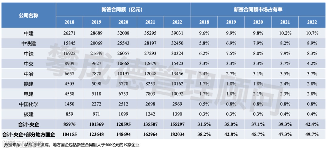 表格中的九大建筑央企,加上新签合同额500亿以上的19家地方国企,2022年新签合同额市场占有率接近50%。如果再加上其他非建筑主业的央企、500亿以下的地方国企、混改的企业,合计差不多能占到65%,这些数据跟各位的体验是否一致,大家可以探讨,我也问过很多行业人士的感觉,跟我们统计的数据大差不差。