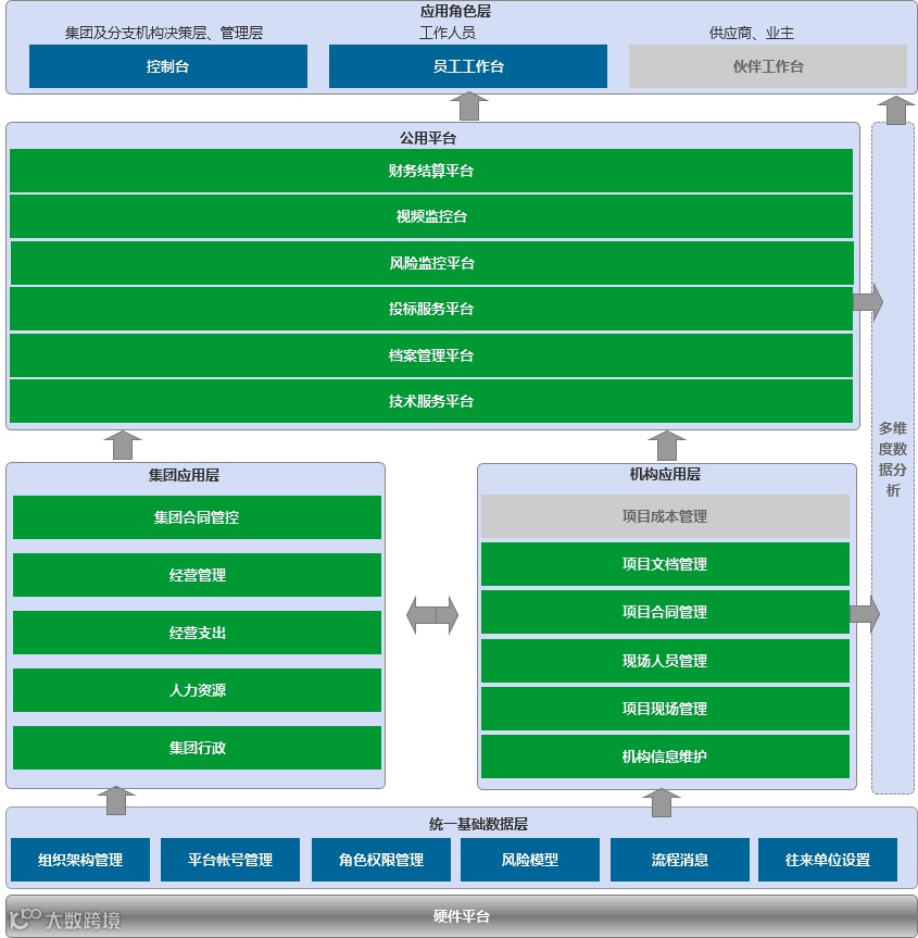 (3)机构应用平台:项目文档管控平台、项目合同管理平台、项目现场人员管理平台、项目现场管理平台;成本管控平台;