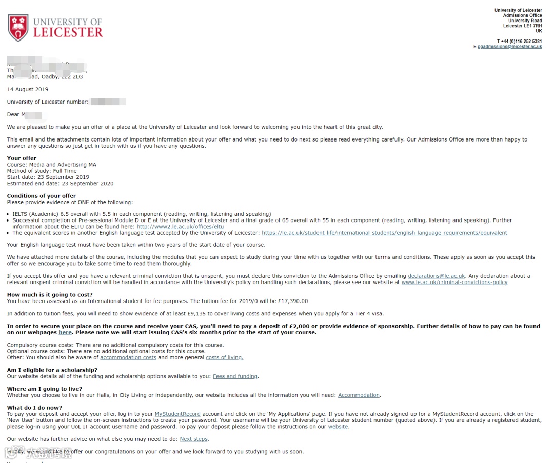 << 李同学莱斯特大学硕士offer >>