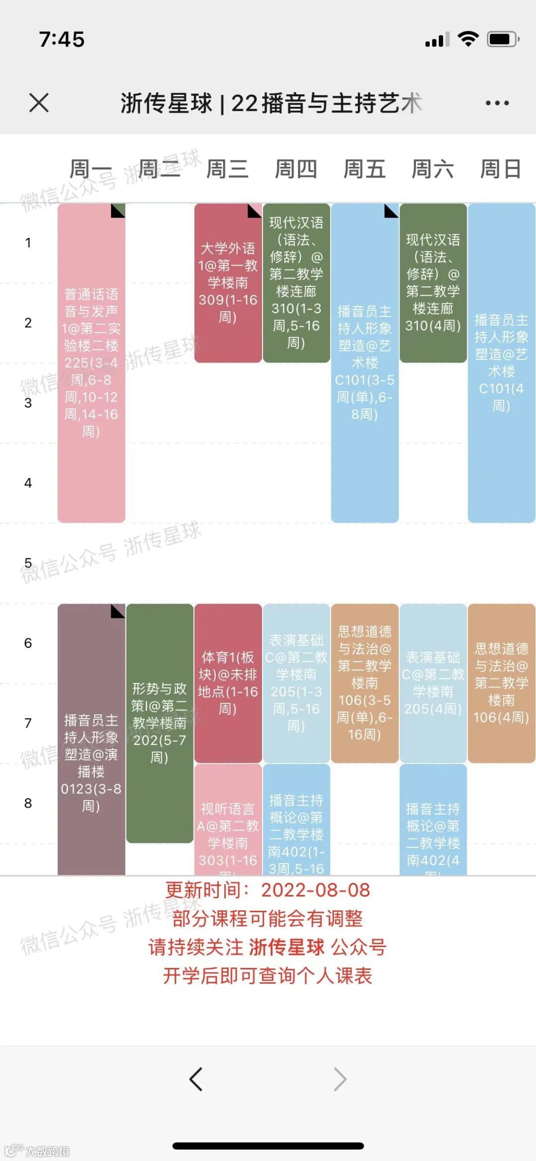 3、本课表为班级课表,仅供参考。最终个人课表请在开学选课后向“浙传星球”回复“课表”即可查询。