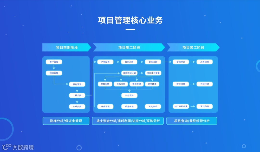 提供标准化的项目管理平台,项目全流程管控,多维度数据分析,提供经营看板、项目看板等数据多维度分析及展示。