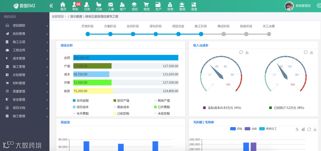 EM2工程企业管理系统,打破了传统软件单一业务处理模式, 不仅解决企业中各职能部门间信息传递、共享的基本问题, 更通过协同办公与项目管理中业务结合, 为管理层实时推送业务流程监控、项目节点监控、项目成本、资金流、项目盈利分析、 项目占资情况、 项目进度、 项目质量安全以及供应链等项目业务数据统计分析。