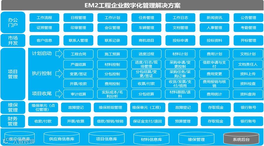 适用行业:基于EM2强大灵活的技术平台,可快速适配机电工程、消防工程、装饰工程、建筑智能、电力工程、园林工程、光伏工程、环保工程、建筑市政等专业的项目管理及企业运营管理。
