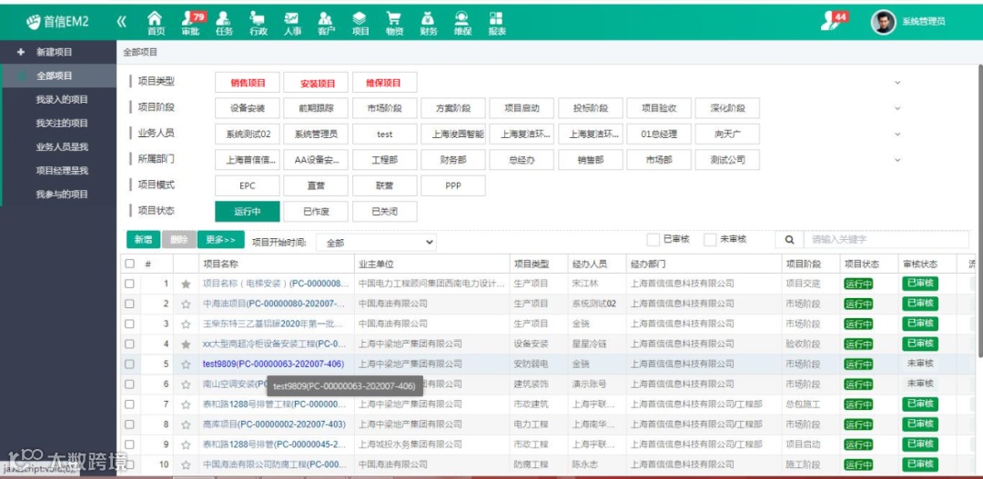 天目集团电梯公司主营业务:电梯销售、安装以及维保业务。首信软件根据天目集团电梯公司项目类型进行分类:销售项目(销售合同、销售采购、销售付款、入库以及出库管理和销售收款开票等)、安装项目(项目信息、现场、进度、财务、合同、文档等)以及维保项目;结合业务需求和实际情况,构建项目信息化管理平台,以提高企业的管理水平和效益为目标,建设功能适用、完备的、具有天目集团电梯公司特色的项目管理系统。